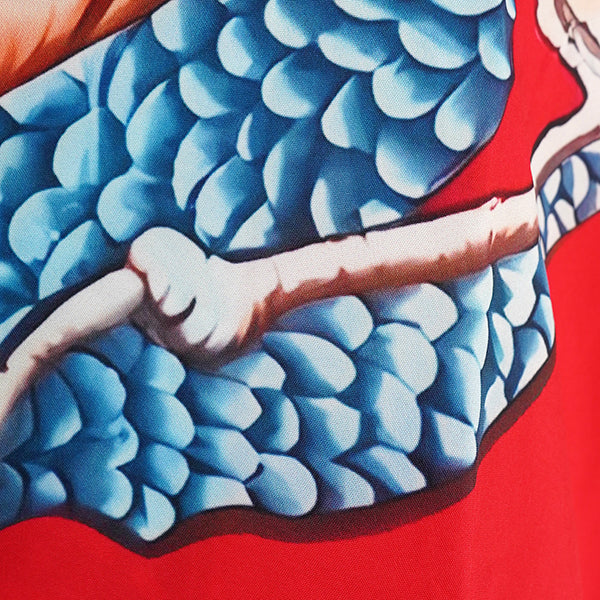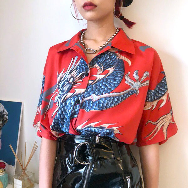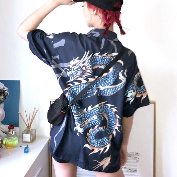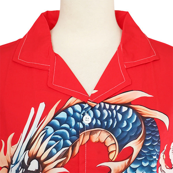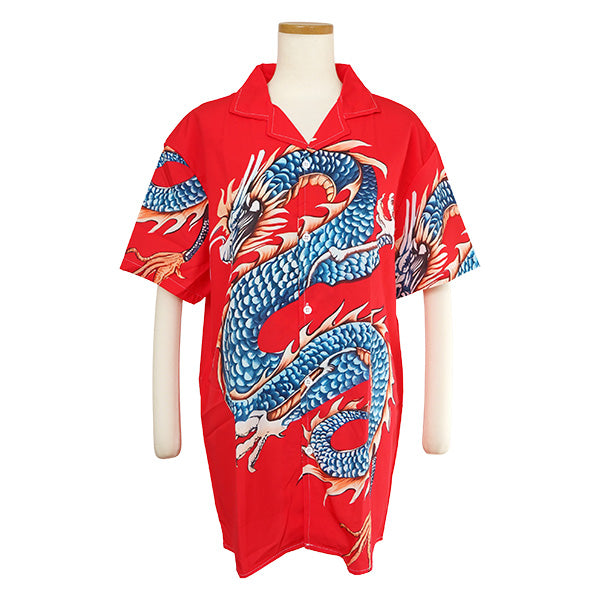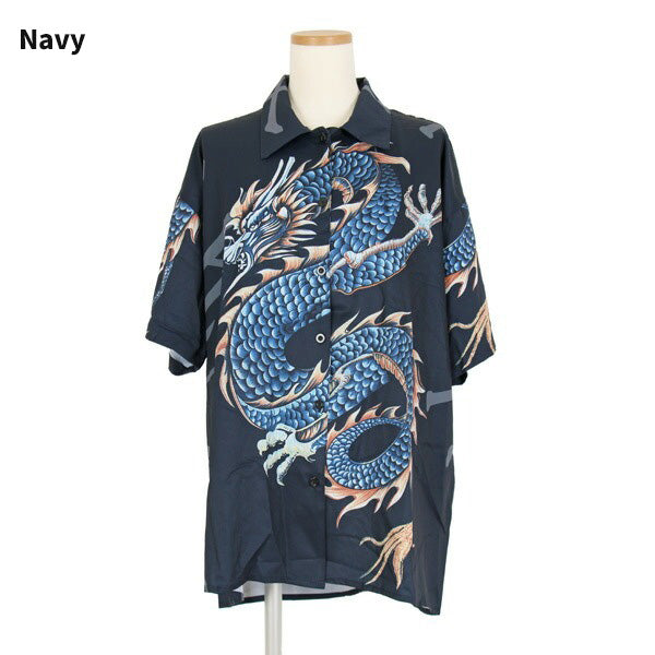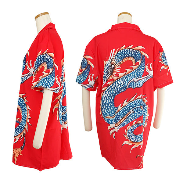 迫力抜群な昇り龍プリントが前後にプリントされた和柄オープンカラーシャツ。