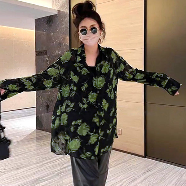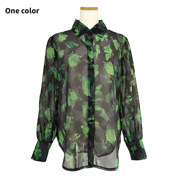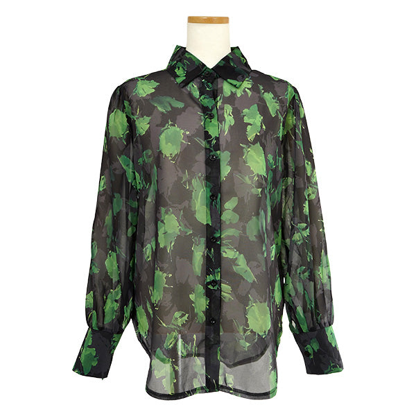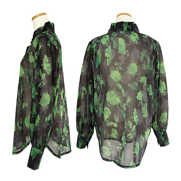 ブラックにグリーンの花びらが目を引く長袖シャツ。