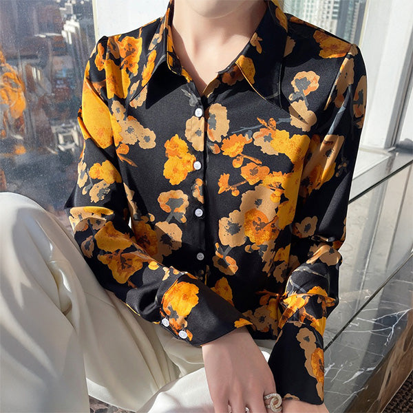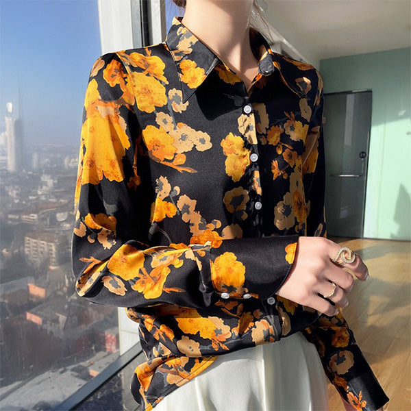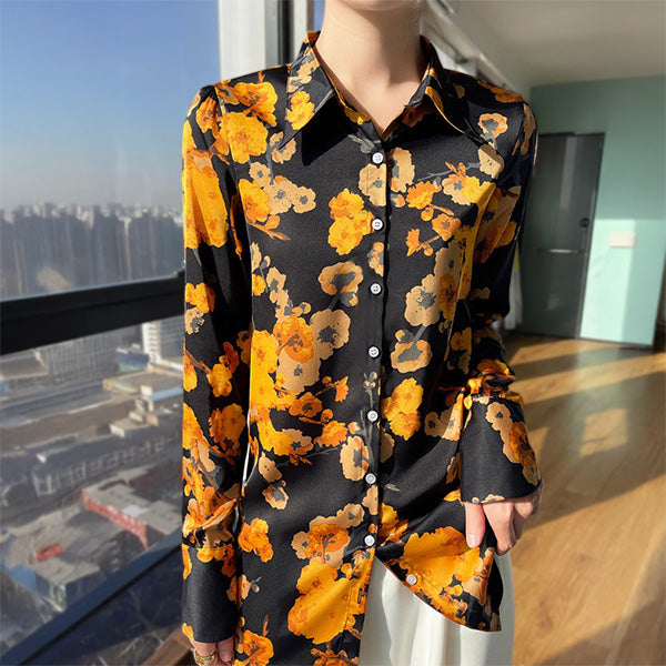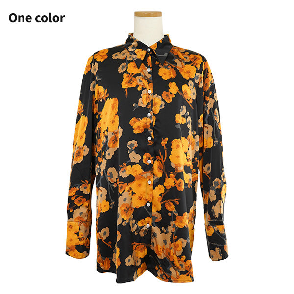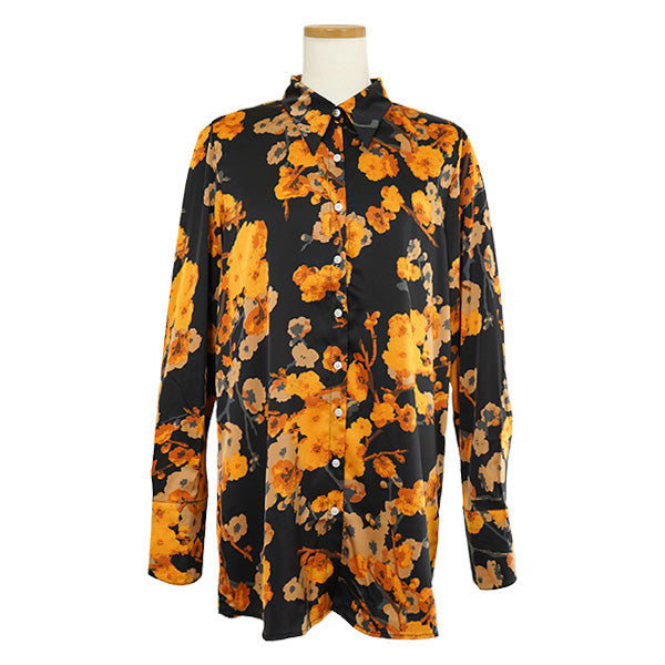 ブラックをベースに、オレンジのフラワープリントが深みを増す長袖シャツ。