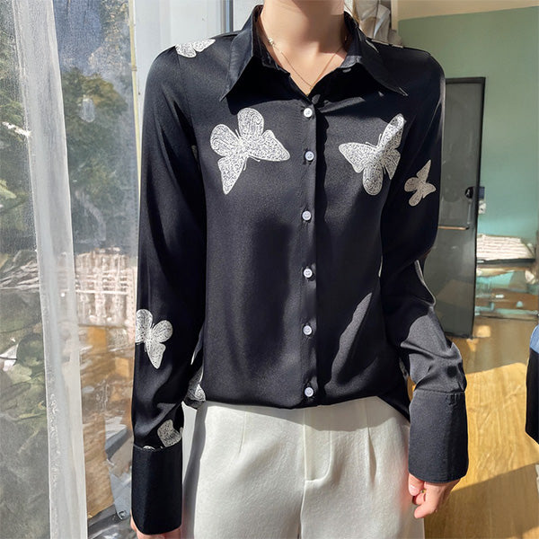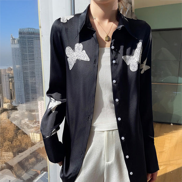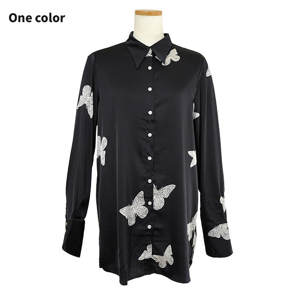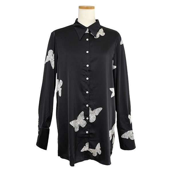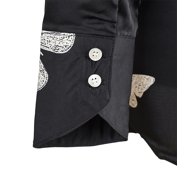 黒をベースに、白い蝶とのコントラストが特徴的な長袖シャツ。
