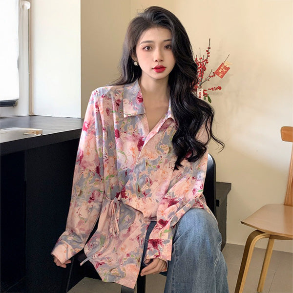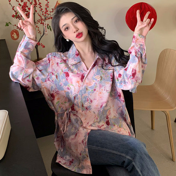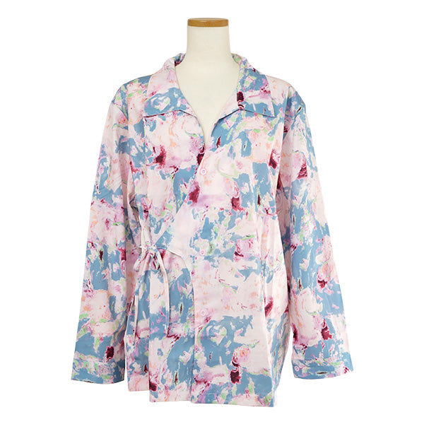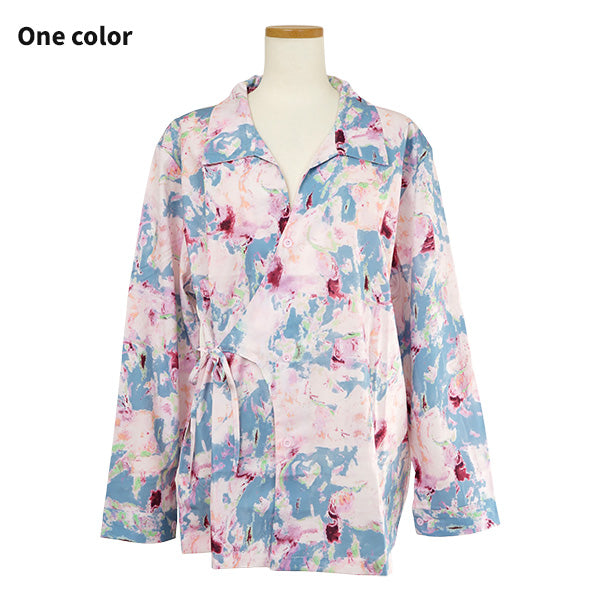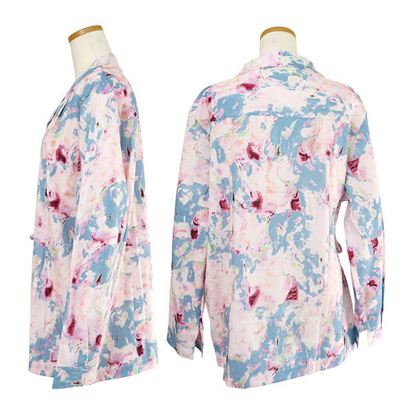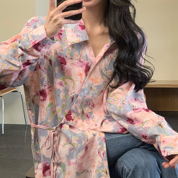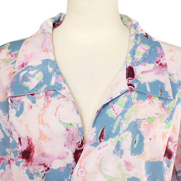 ピンクカラーをベースにしたマーブル柄の長袖シャツ。
