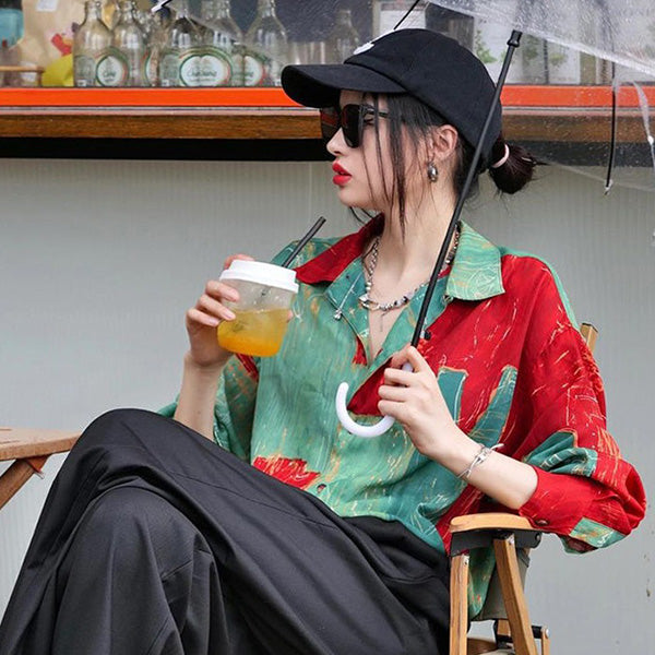 大胆な色使いが目を惹く、アート感覚あふれるオープンカラー長袖シャツ。