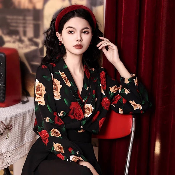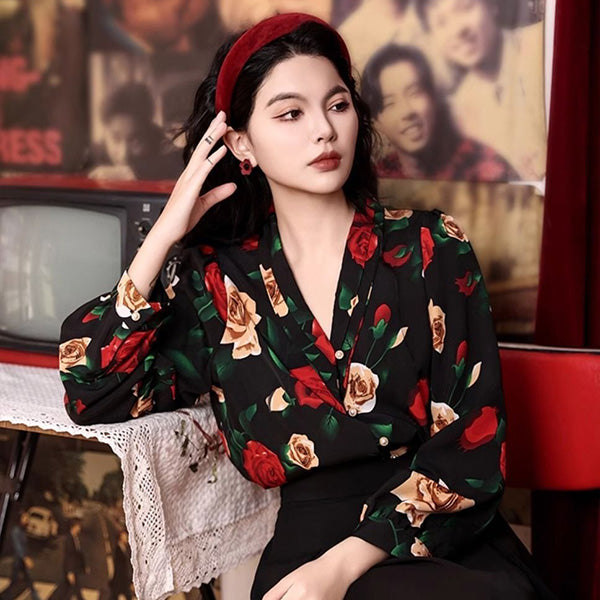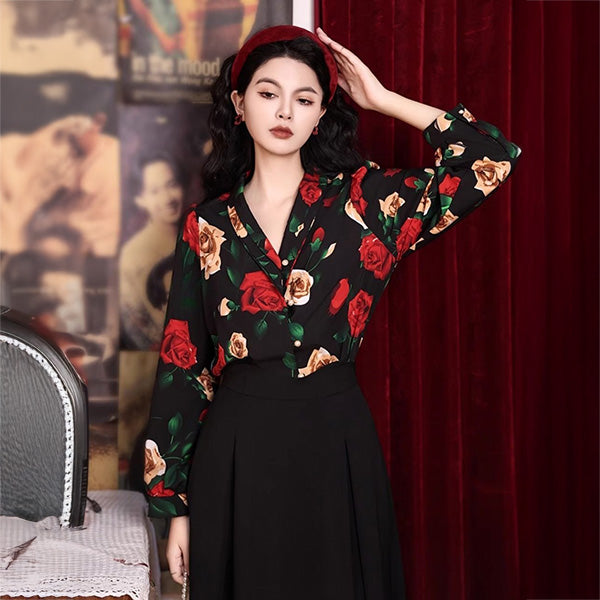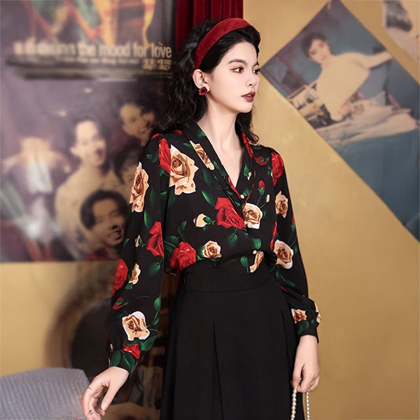 レトロエレガンスを感じるバラ柄の長袖ブラウス。