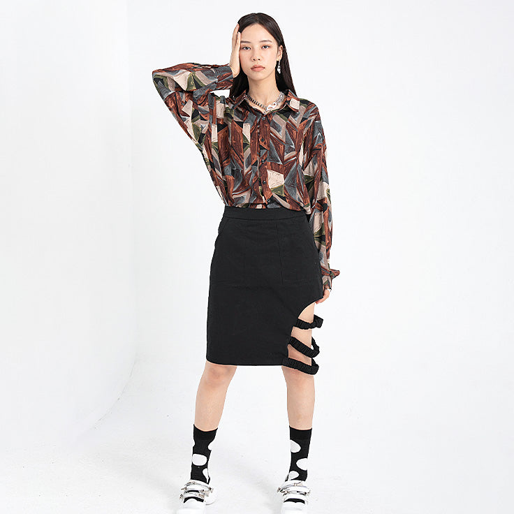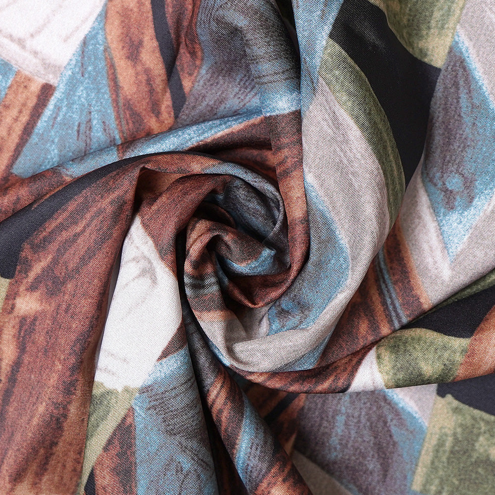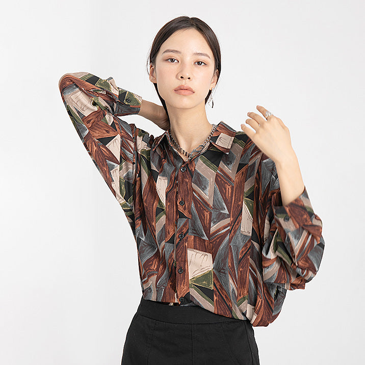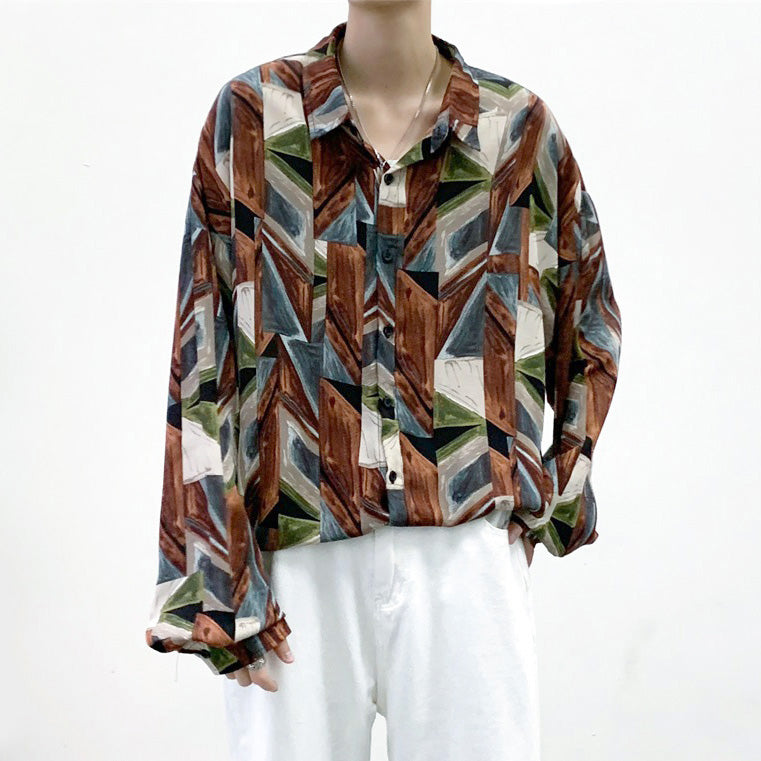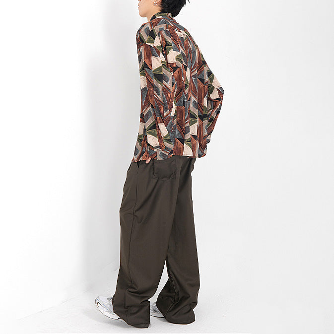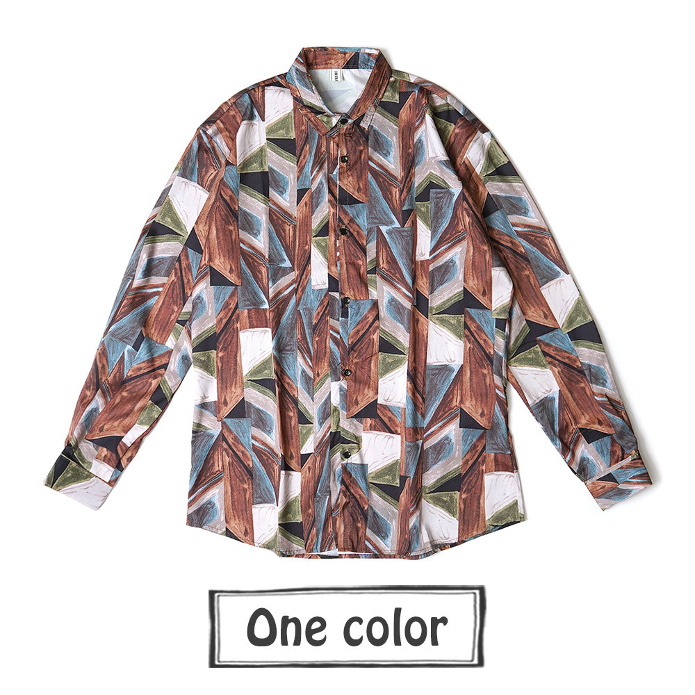 油絵タッチの幾何学模様がおしゃれな長袖シャツ。