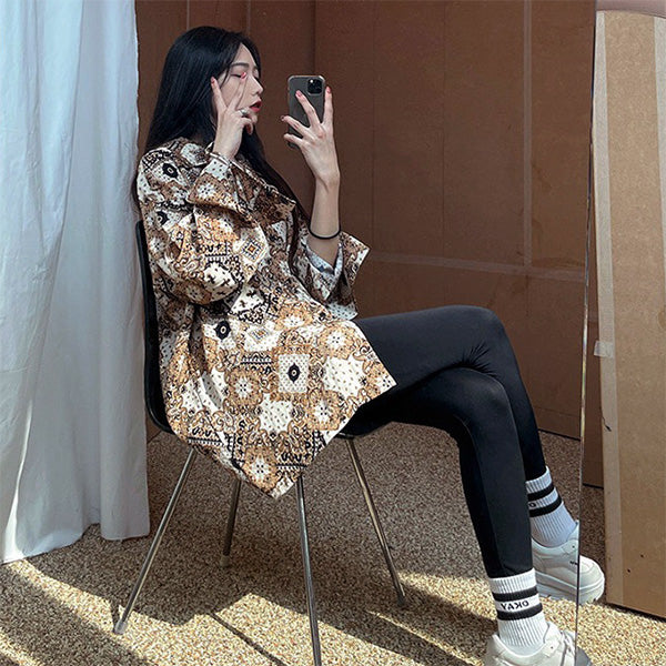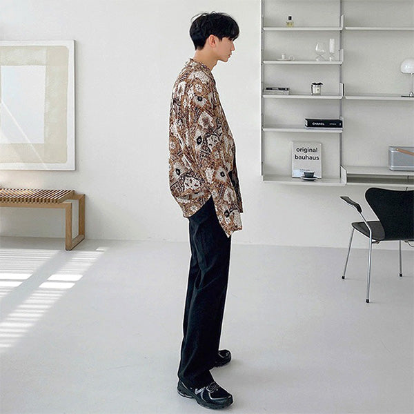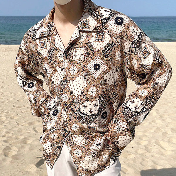 細かい柄ゆきが雰囲気たっぷりなスカーフ柄の長袖シャツ。
