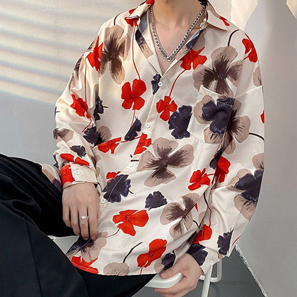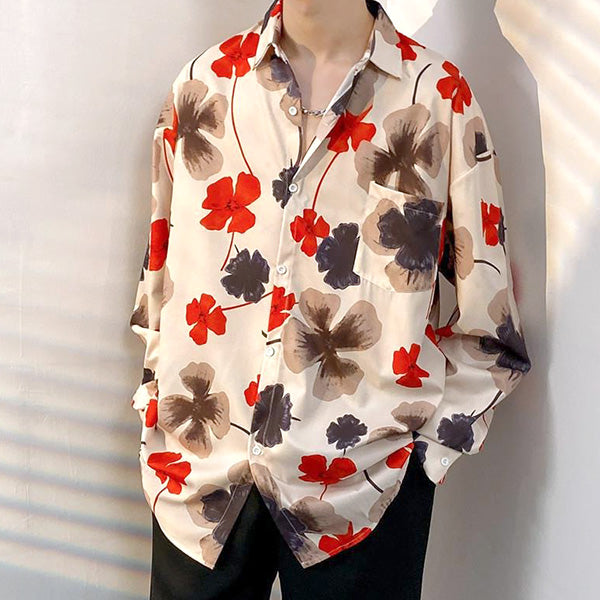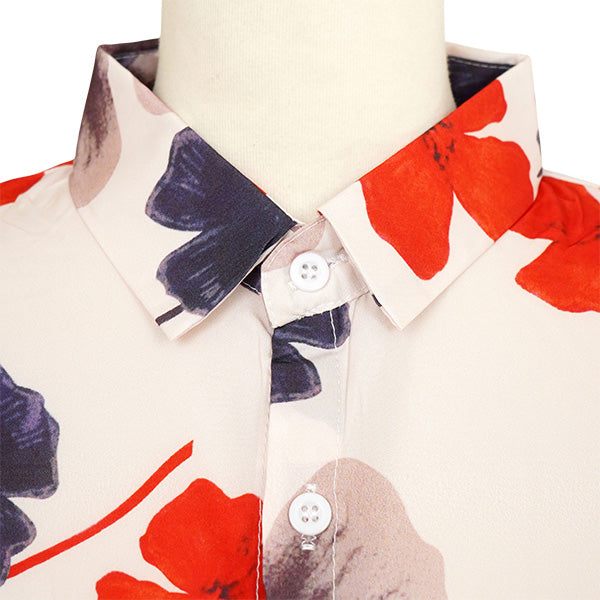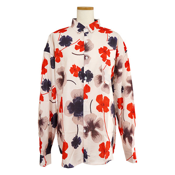 オレンジレッドのフラワー柄がポイントとなった長袖シャツ。